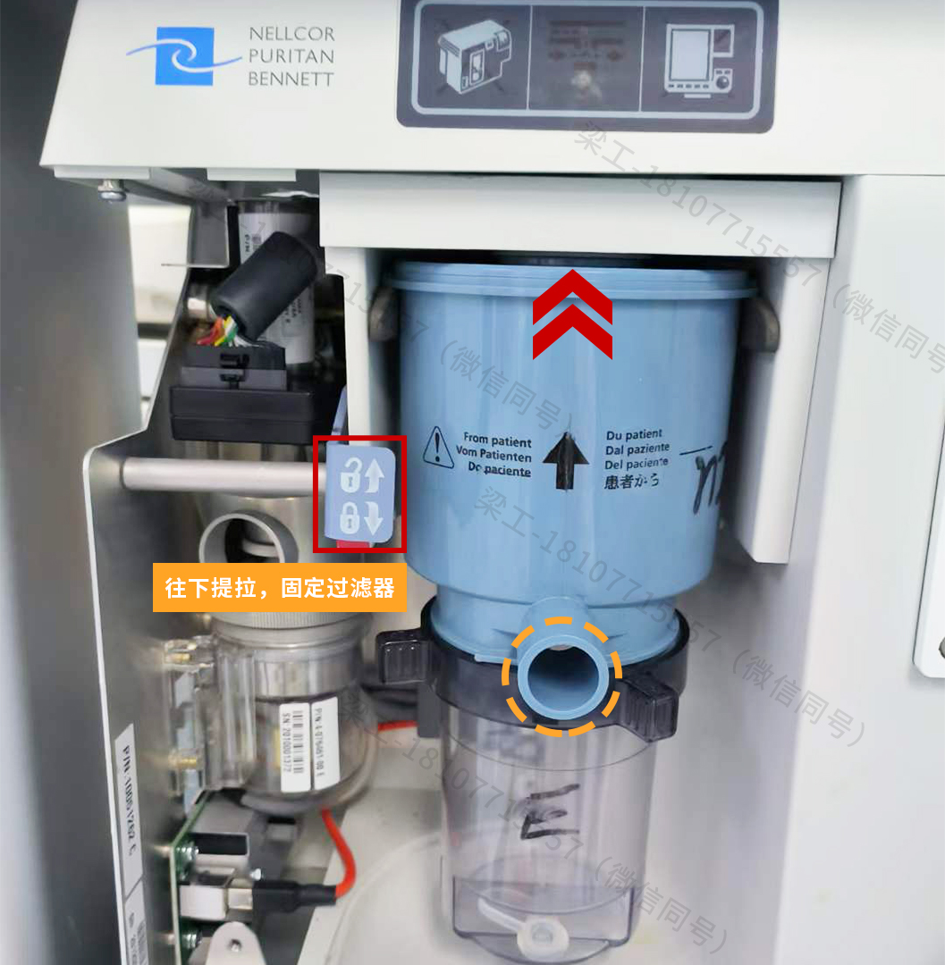 1.將呼出端過濾器鎖扣向右邊旋轉,聽到“咔”的一聲即可。 2.將集水杯排水口膠塞與呼氣支口對準在同一水平線上,將集水杯卡緊在過濾器下方,然后往左邊扭緊。 3.將呼吸機主機左側鎖定裝置往上提拉至解鎖狀態(tài)。 4.將呼氣支口朝外,沿滑軌放入,并使呼出端過濾器邊緣滑到安裝槽內(nèi),推到最里面,推到不能推動為止;放下左側鎖定裝置,固定呼出端過濾器。 二、拆卸 1.將左側鎖定裝置往上提拉至解鎖狀態(tài),取出呼出端過濾器。 2.將呼出端過濾器鎖扣向右邊旋轉,取下集水杯。 3.將集水杯內(nèi)的冷凝水倒入專門收集醫(yī)療廢棄物的容器。 (因為集水杯的冷凝水可能帶有傳染病菌) 4.擦干呼出端過濾器及集水杯的水珠,送去供應室進行消毒。 三、消毒 PB840呼吸機的呼出端和吸氣端過濾器應該采用高溫高壓的方式進行消毒(溫度132-134℃,20分鐘) 注意:溫度不宜超過135℃,禁止浸泡! 四、PB840呼吸機耗材(呼出端過濾器集水杯、吸入端過濾器、呼出端過濾器) PB840呼吸機流量傳感器 PB840呼吸機兼容氧電池 PB840呼吸機空壓機保養(yǎng)套件