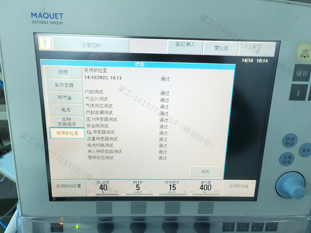 包括:(內(nèi)部測試,氣壓計測試,氣體供應(yīng)測試,內(nèi)部泄漏測試,壓力傳感器測試,安全閥測試,氧氣傳感器測試,流量傳感器測試,電池切換測試,患者呼吸回路測試,報警狀態(tài)測試)。