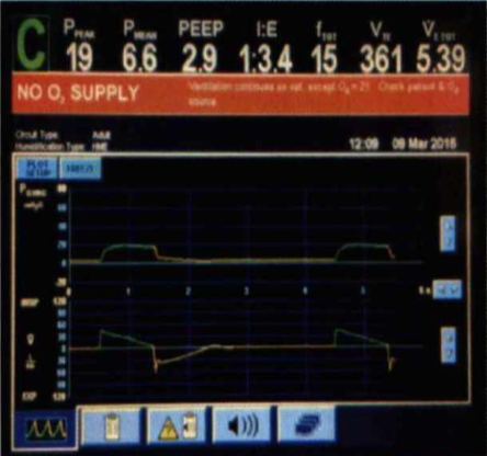 當(dāng)呼吸機(jī)主顯示界面報NO O? SUPPLY,查看報警后提示:Ventilation continues as set. Except O2=21. Check patient & O? source,此時考慮呼吸機(jī)氧氣氣源連接是否順暢,也可能是氧氣氣源壓力不夠?qū)е隆?/span>